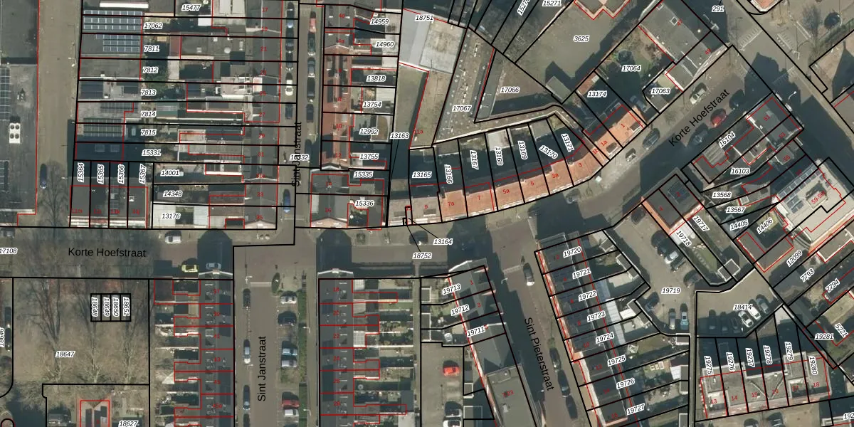 Korte Hoefstraat 9 is gelegen op kadastraal perceel TBG01N13165. Deze kadastrale aanduiding is uniek en wordt gebruikt door het Kadaster om eigendomsrechten en andere zakelijke rechten vast te leggen. Het perceel maakt onderdeel uit van de kadastrale gemeente Tilburg.