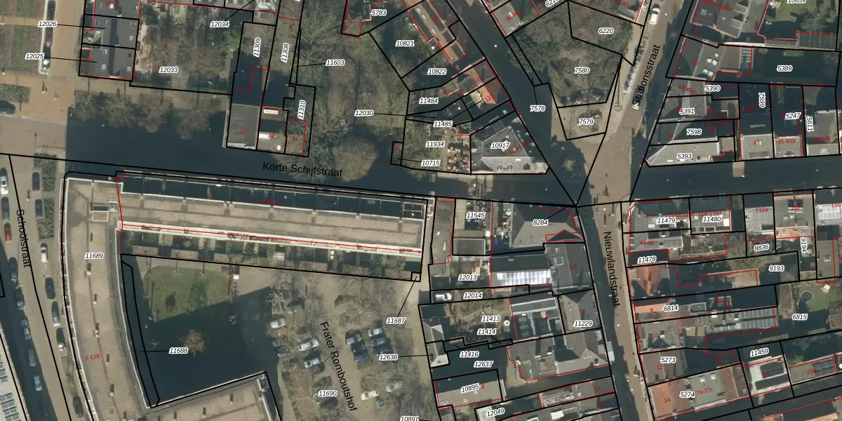 Het perceel waarop Korte Schijfstraat 40 staat heeft een oppervlakte van 2716 m². Dit is een zeer groot perceel. De perceeloppervlakte wordt geregistreerd door het Kadaster. Gedetailleerde informatie over de maten van dit perceel kunt u vinden in het rapport Kadastrale kaart met maatvoering van Korte Schijfstraat 40.