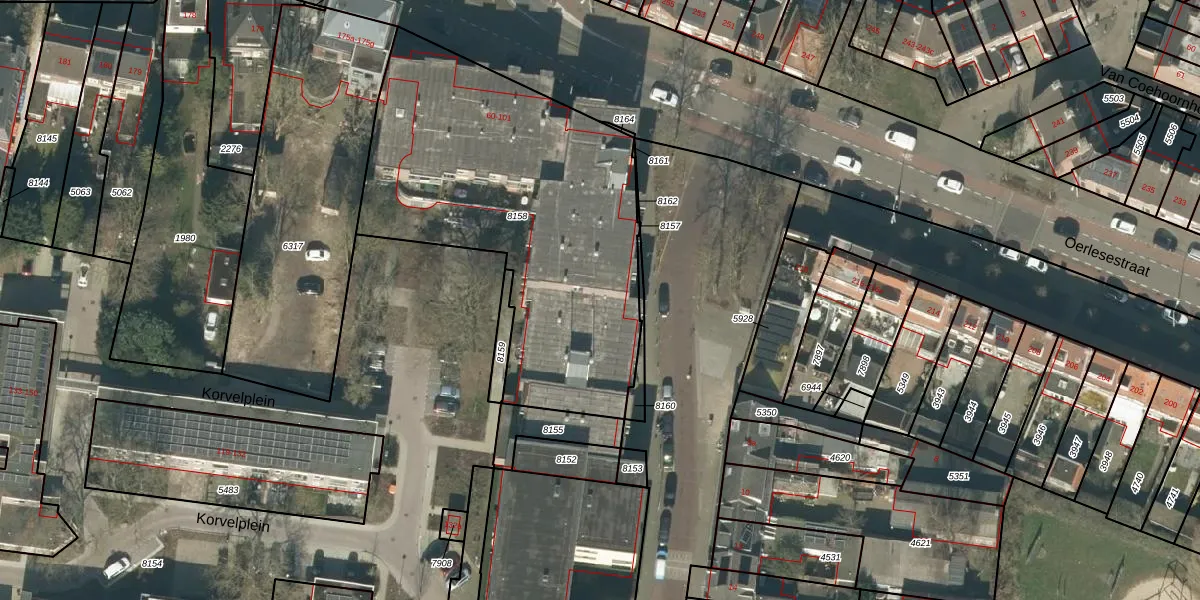 Het perceel waarop Korvelplein 65 staat heeft een oppervlakte van 1802 m². Dit is een zeer groot perceel. De perceeloppervlakte wordt geregistreerd door het Kadaster. Gedetailleerde informatie over de maten van dit perceel kunt u vinden in het rapport Kadastrale kaart met maatvoering van Korvelplein 65.