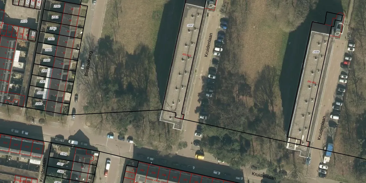 Kruidenlaan 421 is gelegen op kadastraal perceel TBG01AD1697. Deze kadastrale aanduiding is uniek en wordt gebruikt door het Kadaster om eigendomsrechten en andere zakelijke rechten vast te leggen. Het perceel maakt onderdeel uit van de kadastrale gemeente Tilburg.