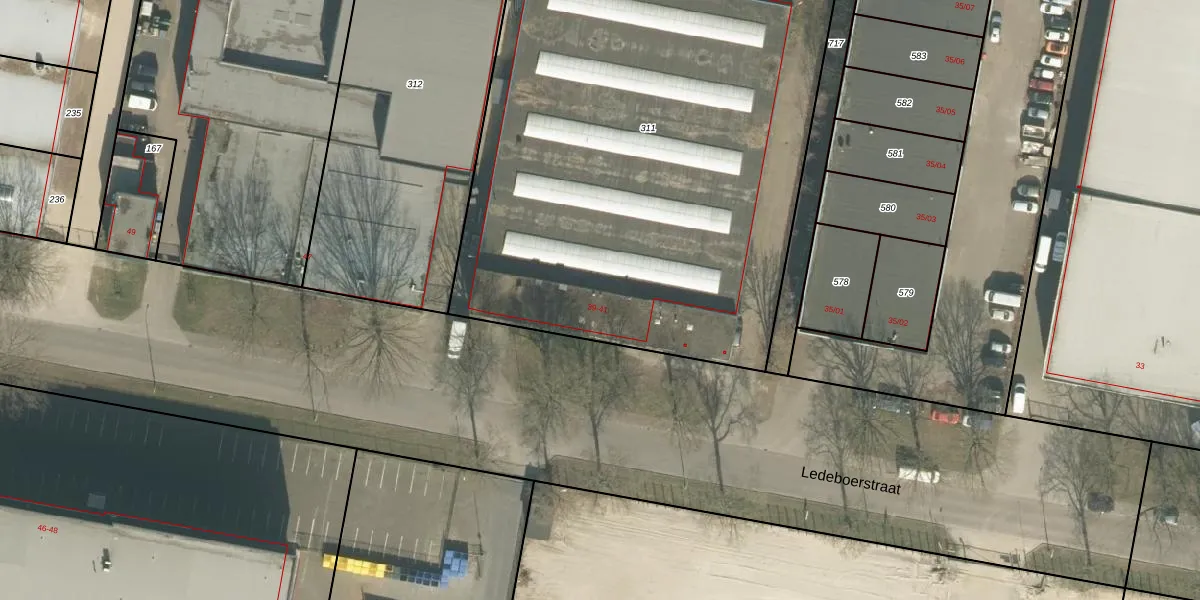 Het perceel waarop Ledeboerstraat 41 staat heeft een oppervlakte van 3504 m². Dit is een zeer groot perceel. De perceeloppervlakte wordt geregistreerd door het Kadaster. Gedetailleerde informatie over de maten van dit perceel kunt u vinden in het rapport Kadastrale kaart met maatvoering van Ledeboerstraat 41.