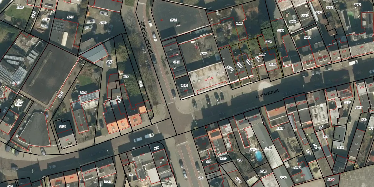 Het perceel waarop Leharstraat 100 staat heeft een oppervlakte van 95 m². Dit is een klein perceel. De perceeloppervlakte wordt geregistreerd door het Kadaster. Gedetailleerde informatie over de maten van dit perceel kunt u vinden in het rapport Kadastrale kaart met maatvoering van Leharstraat 100.