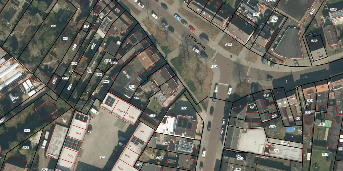 Het perceel waarop Leharstraat 83 staat heeft een oppervlakte van 384 m². Dit is een groot perceel. De perceeloppervlakte wordt geregistreerd door het Kadaster. Gedetailleerde informatie over de maten van dit perceel kunt u vinden in het rapport Kadastrale kaart met maatvoering van Leharstraat 83.