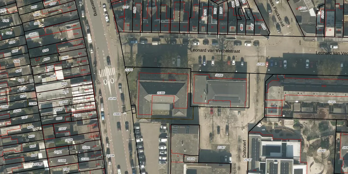 Het perceel waarop Leonard van Vechelstraat 4-08 staat heeft een oppervlakte van 1005 m². Dit is een zeer groot perceel. De perceeloppervlakte wordt geregistreerd door het Kadaster. Gedetailleerde informatie over de maten van dit perceel kunt u vinden in het rapport Kadastrale kaart met maatvoering van Leonard van Vechelstraat 4-08.