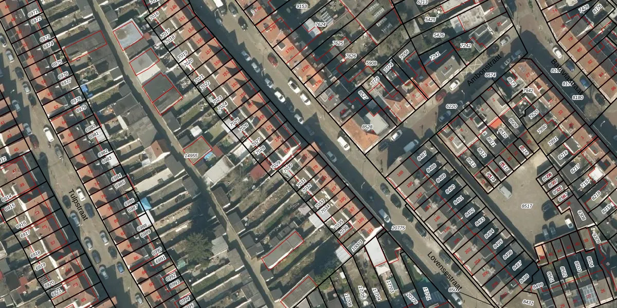Het perceel waarop Lovensestraat 177 staat heeft een oppervlakte van 63 m². Dit is een klein perceel. De perceeloppervlakte wordt geregistreerd door het Kadaster. Gedetailleerde informatie over de maten van dit perceel kunt u vinden in het rapport Kadastrale kaart met maatvoering van Lovensestraat 177.