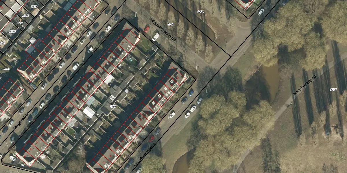 Het perceel waarop Maarheezepark 16 staat heeft een oppervlakte van 5334 m². Dit is een zeer groot perceel. De perceeloppervlakte wordt geregistreerd door het Kadaster. Gedetailleerde informatie over de maten van dit perceel kunt u vinden in het rapport Kadastrale kaart met maatvoering van Maarheezepark 16.