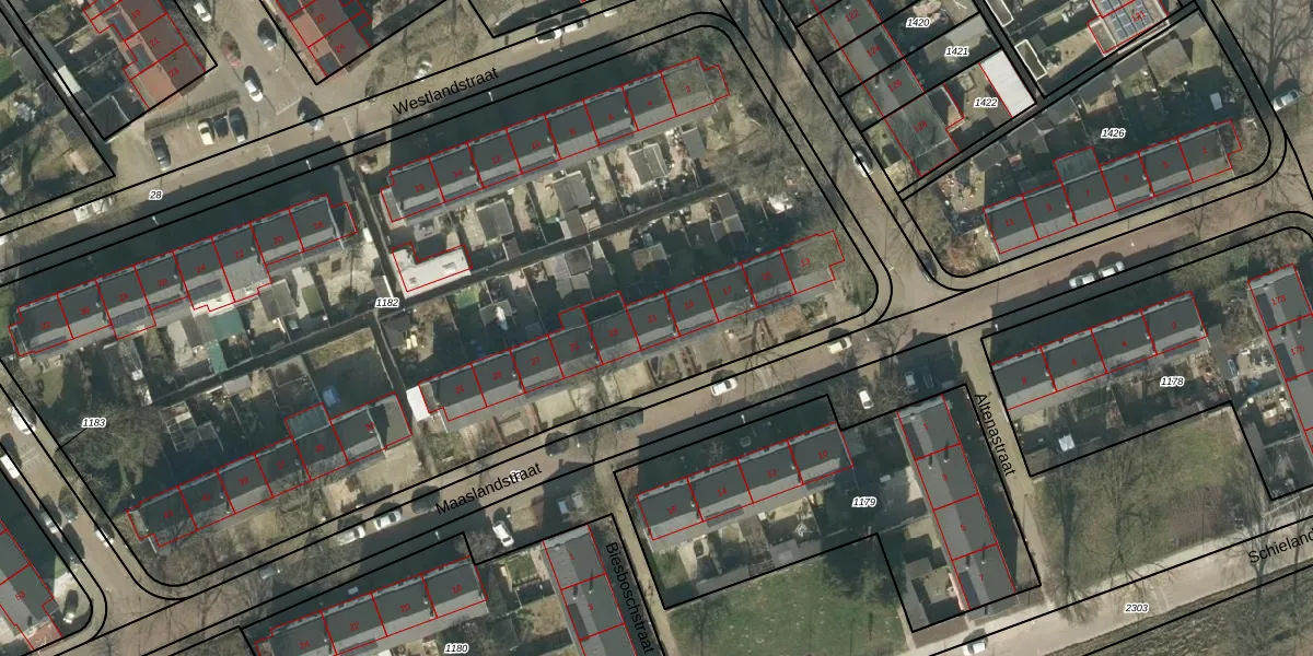 Het perceel waarop Maaslandstraat 21 staat heeft een oppervlakte van 6120 m². Dit is een zeer groot perceel. De perceeloppervlakte wordt geregistreerd door het Kadaster. Gedetailleerde informatie over de maten van dit perceel kunt u vinden in het rapport Kadastrale kaart met maatvoering van Maaslandstraat 21.