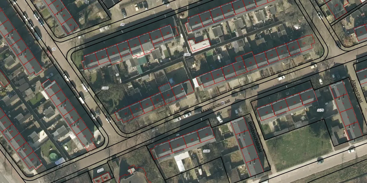 Het perceel waarop Maaslandstraat 33 staat heeft een oppervlakte van 6120 m². Dit is een zeer groot perceel. De perceeloppervlakte wordt geregistreerd door het Kadaster. Gedetailleerde informatie over de maten van dit perceel kunt u vinden in het rapport Kadastrale kaart met maatvoering van Maaslandstraat 33.