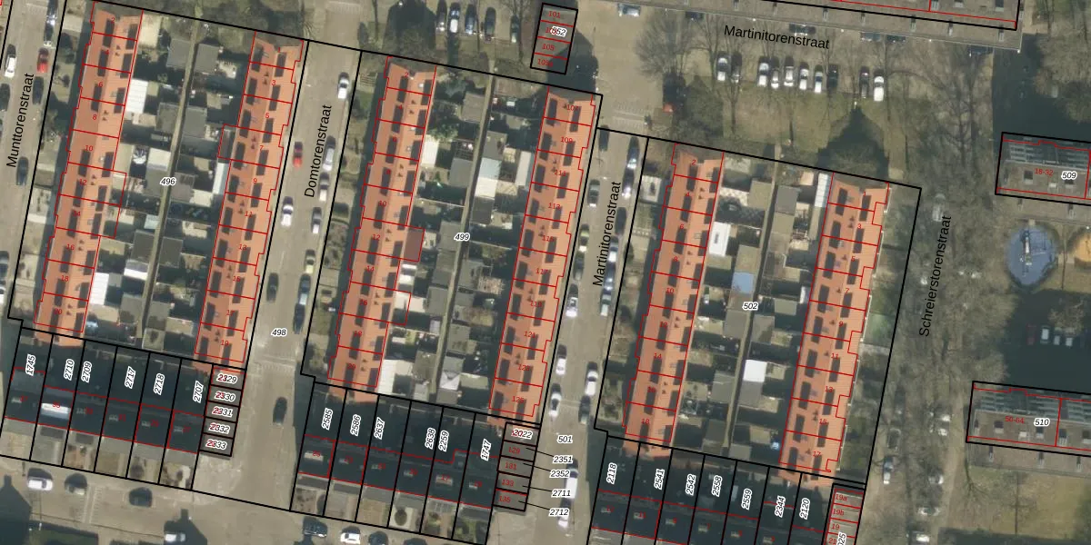 Het perceel waarop Martinitorenstraat 117 staat heeft een oppervlakte van 2756 m². Dit is een zeer groot perceel. De perceeloppervlakte wordt geregistreerd door het Kadaster. Gedetailleerde informatie over de maten van dit perceel kunt u vinden in het rapport Kadastrale kaart met maatvoering van Martinitorenstraat 117.