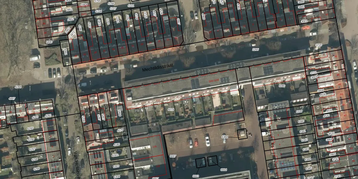 Het perceel waarop Mechtildisstraat 2-23 staat heeft een oppervlakte van 2400 m². Dit is een zeer groot perceel. De perceeloppervlakte wordt geregistreerd door het Kadaster. Gedetailleerde informatie over de maten van dit perceel kunt u vinden in het rapport Kadastrale kaart met maatvoering van Mechtildisstraat 2-23.