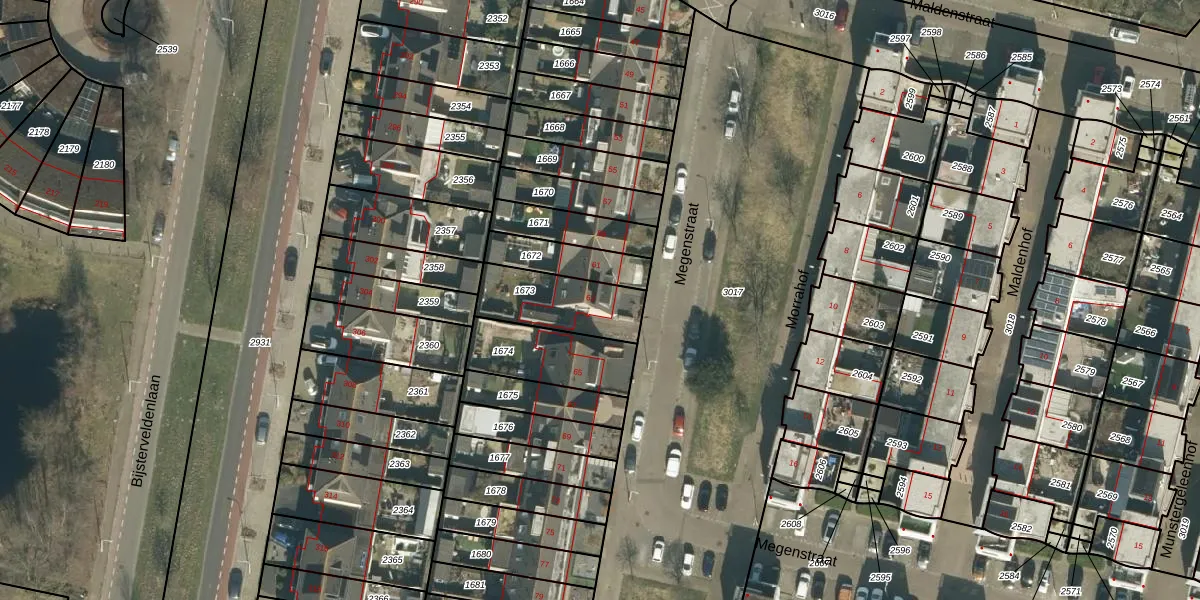 Het perceel waarop Megenstraat 63 staat heeft een oppervlakte van 250 m². Dit is een middelgroot perceel. De perceeloppervlakte wordt geregistreerd door het Kadaster. Gedetailleerde informatie over de maten van dit perceel kunt u vinden in het rapport Kadastrale kaart met maatvoering van Megenstraat 63.