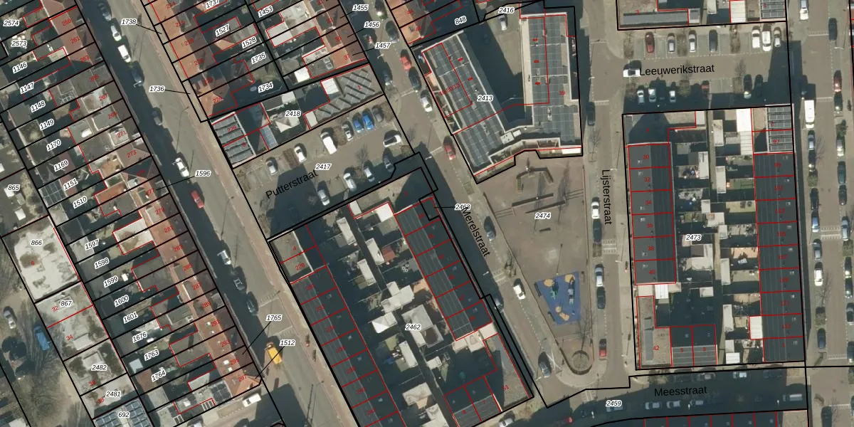 Het perceel waarop Merelstraat 39 staat heeft een oppervlakte van 45 m². Dit is een klein perceel. De perceeloppervlakte wordt geregistreerd door het Kadaster. Gedetailleerde informatie over de maten van dit perceel kunt u vinden in het rapport Kadastrale kaart met maatvoering van Merelstraat 39.