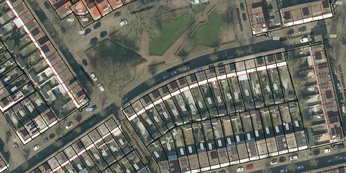 Merodeplein 14 is gelegen op kadastraal perceel TBG01R6187. Deze kadastrale aanduiding is uniek en wordt gebruikt door het Kadaster om eigendomsrechten en andere zakelijke rechten vast te leggen. Het perceel maakt onderdeel uit van de kadastrale gemeente Tilburg.