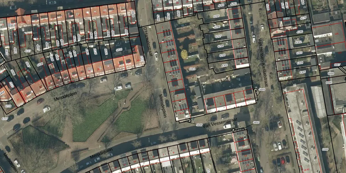Het perceel waarop Merodeplein 3 staat heeft een oppervlakte van 1960 m². Dit is een zeer groot perceel. De perceeloppervlakte wordt geregistreerd door het Kadaster. Gedetailleerde informatie over de maten van dit perceel kunt u vinden in het rapport Kadastrale kaart met maatvoering van Merodeplein 3.