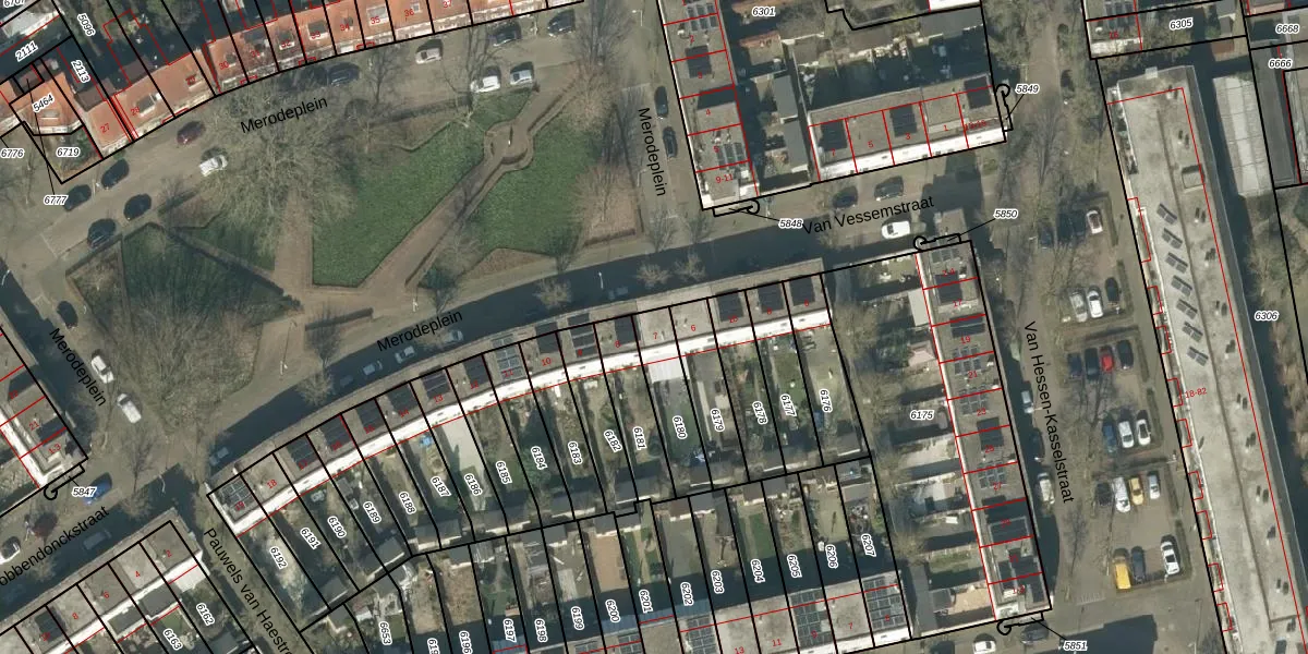 Merodeplein 7 is gelegen op kadastraal perceel TBG01R6180. Deze kadastrale aanduiding is uniek en wordt gebruikt door het Kadaster om eigendomsrechten en andere zakelijke rechten vast te leggen. Het perceel maakt onderdeel uit van de kadastrale gemeente Tilburg.