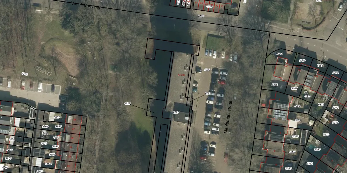 Meulemansstraat 159 is gelegen op kadastraal perceel TBG01S4227. Deze kadastrale aanduiding is uniek en wordt gebruikt door het Kadaster om eigendomsrechten en andere zakelijke rechten vast te leggen. Het perceel maakt onderdeel uit van de kadastrale gemeente Tilburg.