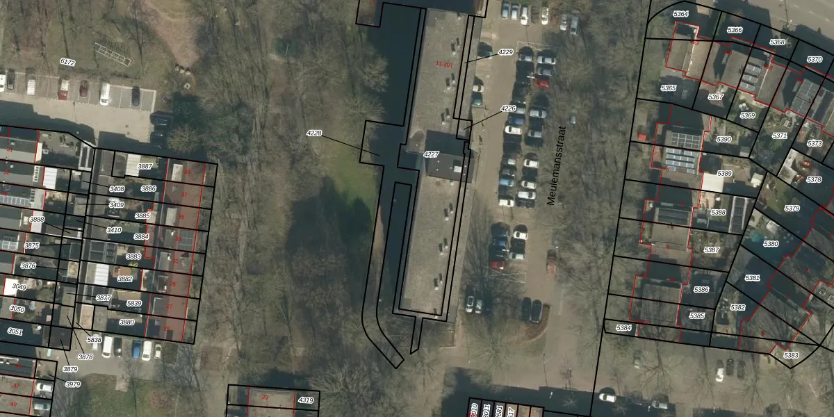 Meulemansstraat 197 is gelegen op kadastraal perceel TBG01S4227. Deze kadastrale aanduiding is uniek en wordt gebruikt door het Kadaster om eigendomsrechten en andere zakelijke rechten vast te leggen. Het perceel maakt onderdeel uit van de kadastrale gemeente Tilburg.