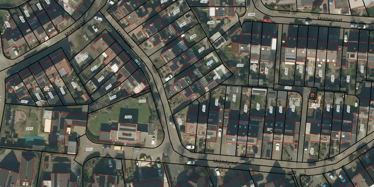 Middelgraaf 65 is gelegen op kadastraal perceel TBG01AA1911. Deze kadastrale aanduiding is uniek en wordt gebruikt door het Kadaster om eigendomsrechten en andere zakelijke rechten vast te leggen. Het perceel maakt onderdeel uit van de kadastrale gemeente Tilburg.
