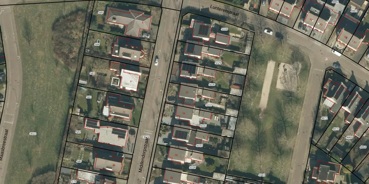 Middendorpstraat 12 is gelegen op kadastraal perceel TBG01AF5031. Deze kadastrale aanduiding is uniek en wordt gebruikt door het Kadaster om eigendomsrechten en andere zakelijke rechten vast te leggen. Het perceel maakt onderdeel uit van de kadastrale gemeente Tilburg.