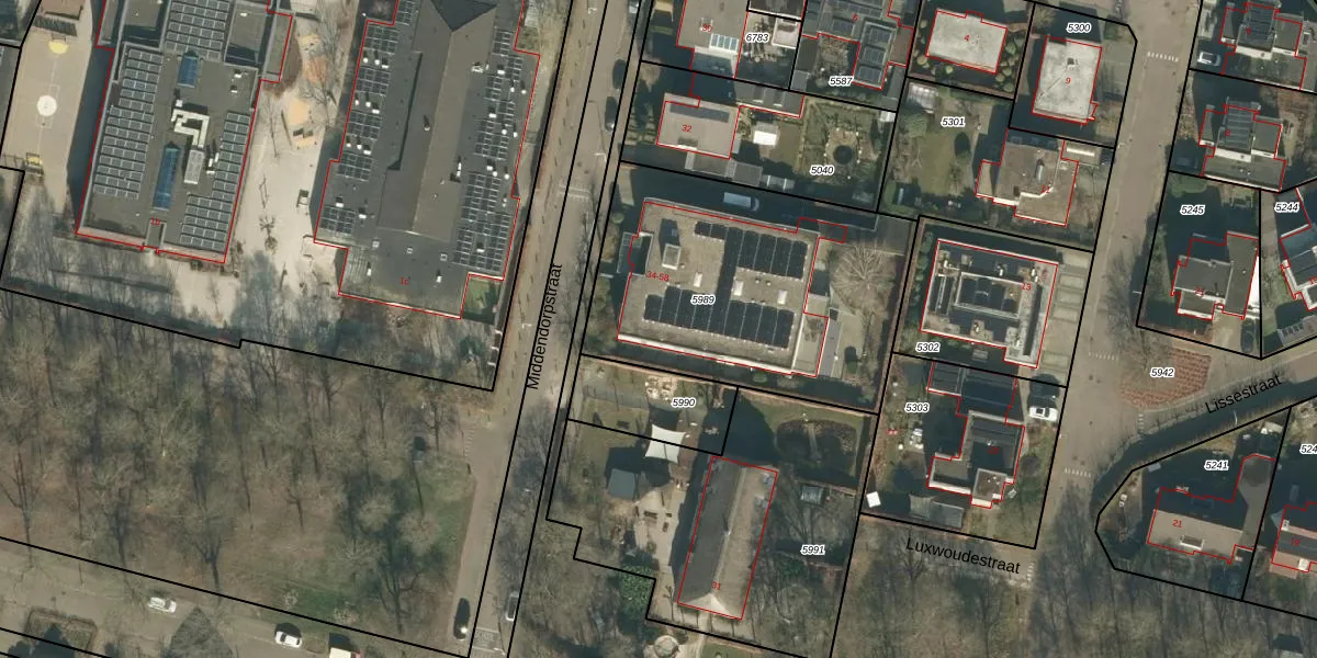 Het perceel waarop Middendorpstraat 46 staat heeft een oppervlakte van 1385 m². Dit is een zeer groot perceel. De perceeloppervlakte wordt geregistreerd door het Kadaster. Gedetailleerde informatie over de maten van dit perceel kunt u vinden in het rapport Kadastrale kaart met maatvoering van Middendorpstraat 46.