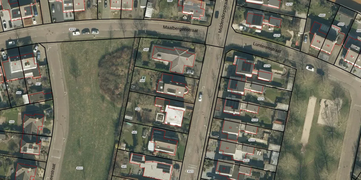 Het perceel waarop Middendorpstraat 7 staat heeft een oppervlakte van 518 m². Dit is een groot perceel. De perceeloppervlakte wordt geregistreerd door het Kadaster. Gedetailleerde informatie over de maten van dit perceel kunt u vinden in het rapport Kadastrale kaart met maatvoering van Middendorpstraat 7.
