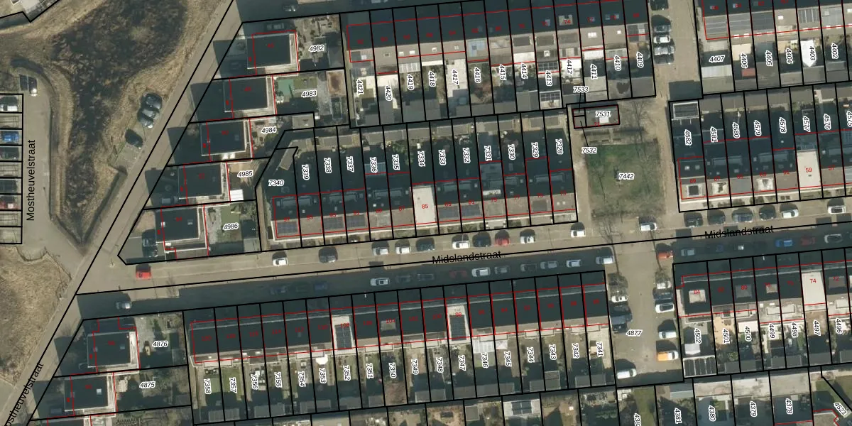 Midslandstraat 85 is gelegen op kadastraal perceel TBG01AG7334. Deze kadastrale aanduiding is uniek en wordt gebruikt door het Kadaster om eigendomsrechten en andere zakelijke rechten vast te leggen. Het perceel maakt onderdeel uit van de kadastrale gemeente Tilburg.