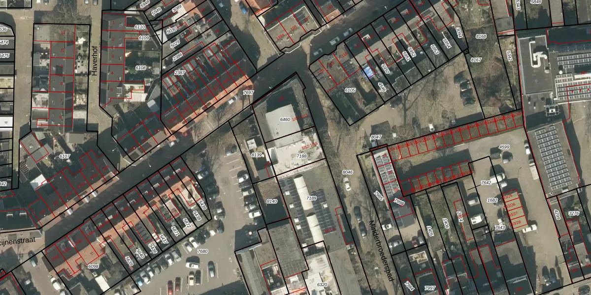 Minderbroederspad 1-13 is gelegen op kadastraal perceel TBG01Q7188. Deze kadastrale aanduiding is uniek en wordt gebruikt door het Kadaster om eigendomsrechten en andere zakelijke rechten vast te leggen. Het perceel maakt onderdeel uit van de kadastrale gemeente Tilburg.