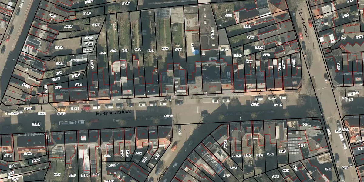 Molenbochtstraat 21 is gelegen op kadastraal perceel TBG01N9637. Deze kadastrale aanduiding is uniek en wordt gebruikt door het Kadaster om eigendomsrechten en andere zakelijke rechten vast te leggen. Het perceel maakt onderdeel uit van de kadastrale gemeente Tilburg.