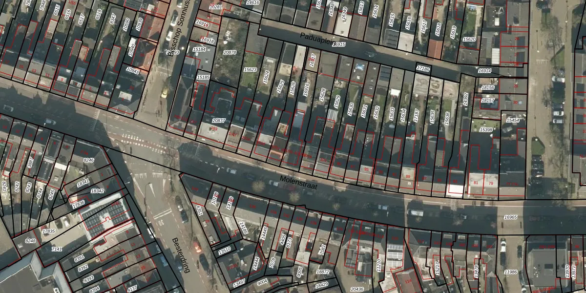 Molenstraat 101-02 is gelegen op kadastraal perceel TBG01N16916. Deze kadastrale aanduiding is uniek en wordt gebruikt door het Kadaster om eigendomsrechten en andere zakelijke rechten vast te leggen. Het perceel maakt onderdeel uit van de kadastrale gemeente Tilburg.