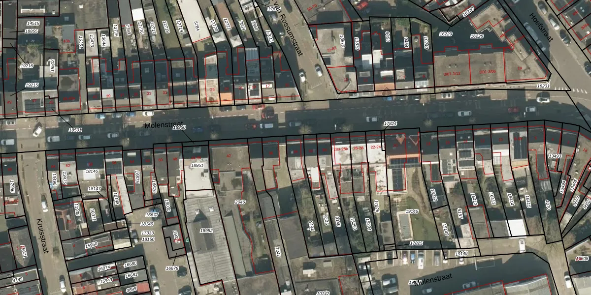 Molenstraat 34 is gelegen op kadastraal perceel TBG01N9144. Deze kadastrale aanduiding is uniek en wordt gebruikt door het Kadaster om eigendomsrechten en andere zakelijke rechten vast te leggen. Het perceel maakt onderdeel uit van de kadastrale gemeente Tilburg.