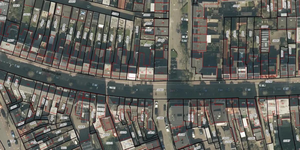 Molenstraat 79 is gelegen op kadastraal perceel TBG01N15398. Deze kadastrale aanduiding is uniek en wordt gebruikt door het Kadaster om eigendomsrechten en andere zakelijke rechten vast te leggen. Het perceel maakt onderdeel uit van de kadastrale gemeente Tilburg.