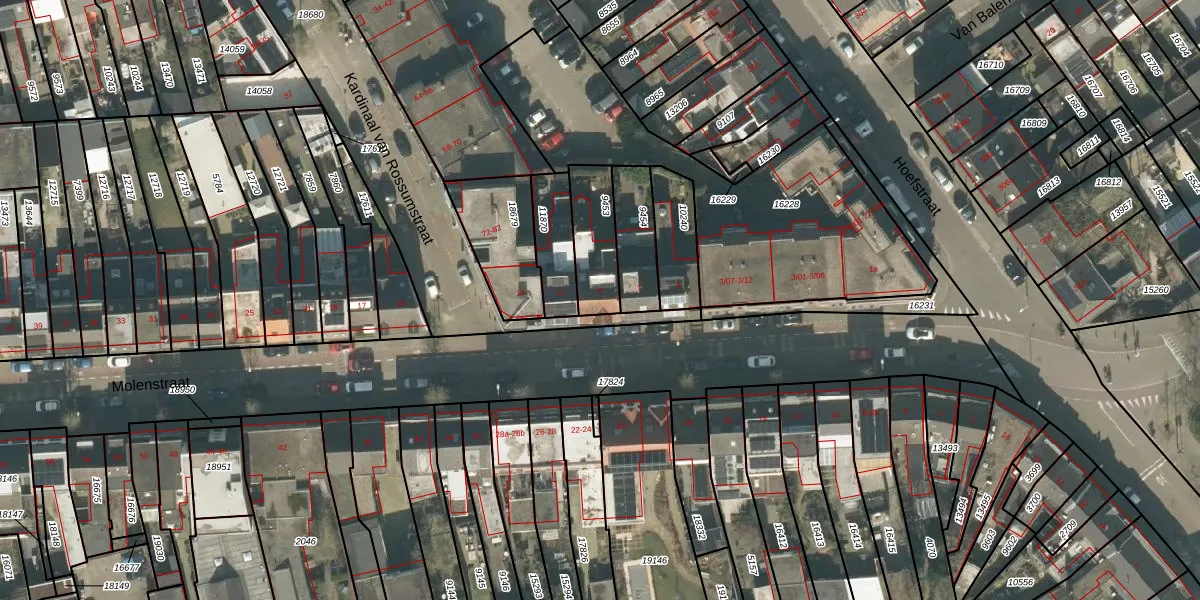 Molenstraat 9 is gelegen op kadastraal perceel TBG01N9453. Deze kadastrale aanduiding is uniek en wordt gebruikt door het Kadaster om eigendomsrechten en andere zakelijke rechten vast te leggen. Het perceel maakt onderdeel uit van de kadastrale gemeente Tilburg.