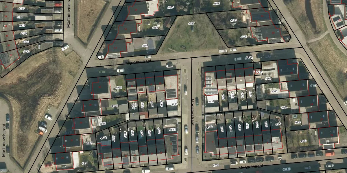 Monsterstraat 1 is gelegen op kadastraal perceel TBG01AG4733. Deze kadastrale aanduiding is uniek en wordt gebruikt door het Kadaster om eigendomsrechten en andere zakelijke rechten vast te leggen. Het perceel maakt onderdeel uit van de kadastrale gemeente Tilburg.