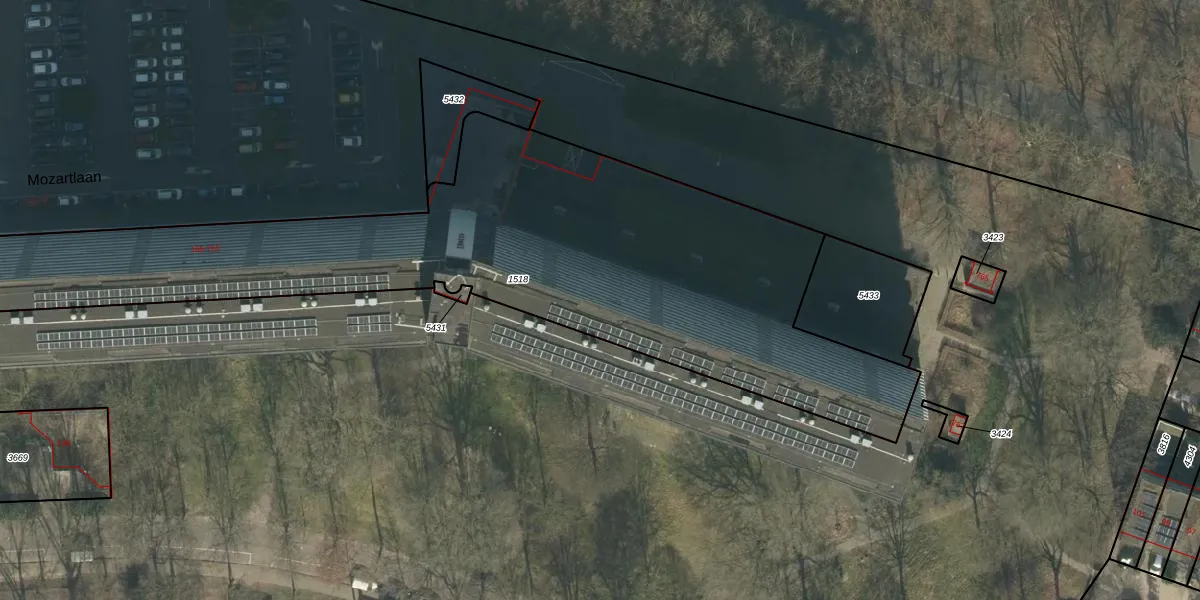 Het perceel waarop Mozartlaan 489 staat heeft een oppervlakte van 3010 m². Dit is een zeer groot perceel. De perceeloppervlakte wordt geregistreerd door het Kadaster. Gedetailleerde informatie over de maten van dit perceel kunt u vinden in het rapport Kadastrale kaart met maatvoering van Mozartlaan 489.