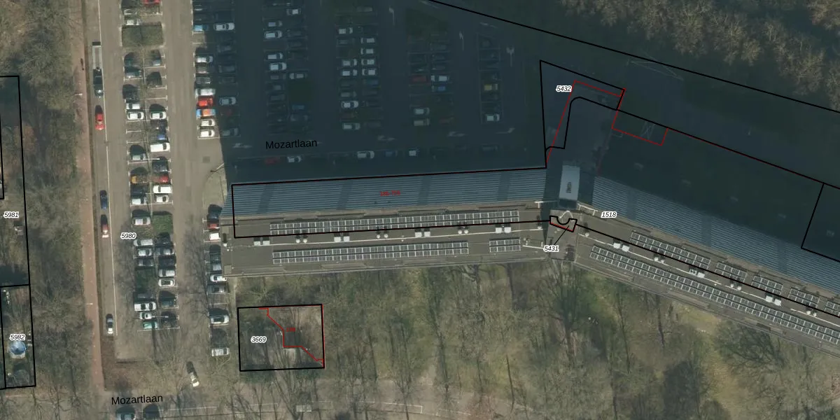 Het perceel waarop Mozartlaan 587 staat heeft een oppervlakte van 3010 m². Dit is een zeer groot perceel. De perceeloppervlakte wordt geregistreerd door het Kadaster. Gedetailleerde informatie over de maten van dit perceel kunt u vinden in het rapport Kadastrale kaart met maatvoering van Mozartlaan 587.