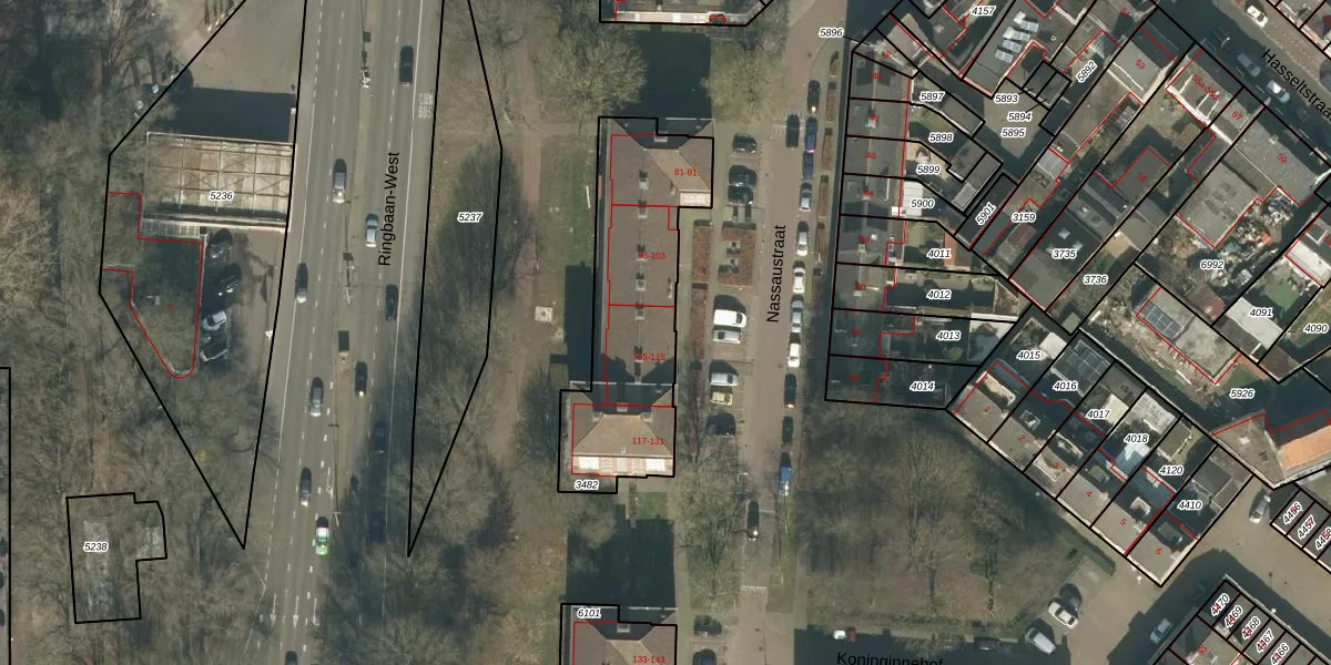 Nassaustraat 105 is gelegen op kadastraal perceel TBG01O3482. Deze kadastrale aanduiding is uniek en wordt gebruikt door het Kadaster om eigendomsrechten en andere zakelijke rechten vast te leggen. Het perceel maakt onderdeel uit van de kadastrale gemeente Tilburg.