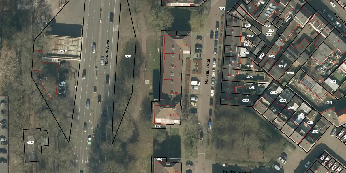 Nassaustraat 107 is gelegen op kadastraal perceel TBG01O3482. Deze kadastrale aanduiding is uniek en wordt gebruikt door het Kadaster om eigendomsrechten en andere zakelijke rechten vast te leggen. Het perceel maakt onderdeel uit van de kadastrale gemeente Tilburg.