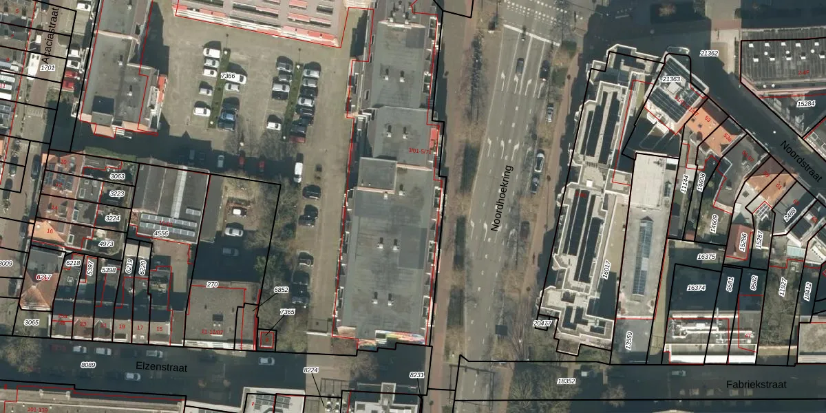 Het perceel waarop Noordhoekring 5-19 staat heeft een oppervlakte van 6631 m². Dit is een zeer groot perceel. De perceeloppervlakte wordt geregistreerd door het Kadaster. Gedetailleerde informatie over de maten van dit perceel kunt u vinden in het rapport Kadastrale kaart met maatvoering van Noordhoekring 5-19.