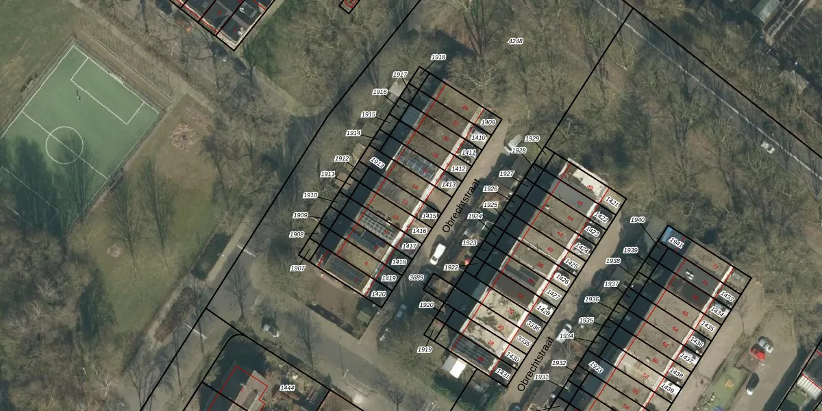 Het perceel waarop Obrechtstraat 12 staat heeft een oppervlakte van 95 m². Dit is een klein perceel. De perceeloppervlakte wordt geregistreerd door het Kadaster. Gedetailleerde informatie over de maten van dit perceel kunt u vinden in het rapport Kadastrale kaart met maatvoering van Obrechtstraat 12.