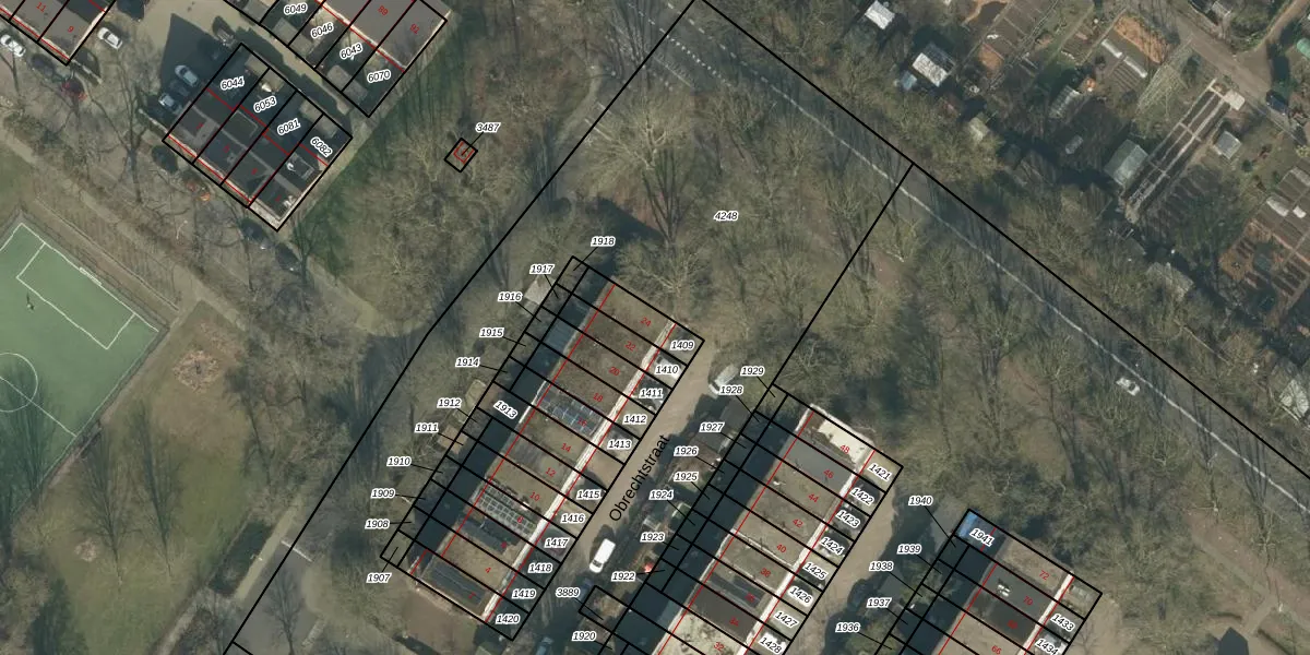 Het perceel waarop Obrechtstraat 24 staat heeft een oppervlakte van 99 m². Dit is een klein perceel. De perceeloppervlakte wordt geregistreerd door het Kadaster. Gedetailleerde informatie over de maten van dit perceel kunt u vinden in het rapport Kadastrale kaart met maatvoering van Obrechtstraat 24.