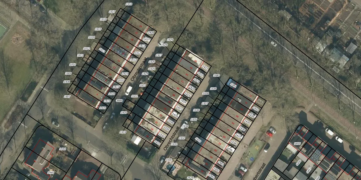Het perceel waarop Obrechtstraat 40 staat heeft een oppervlakte van 95 m². Dit is een klein perceel. De perceeloppervlakte wordt geregistreerd door het Kadaster. Gedetailleerde informatie over de maten van dit perceel kunt u vinden in het rapport Kadastrale kaart met maatvoering van Obrechtstraat 40.