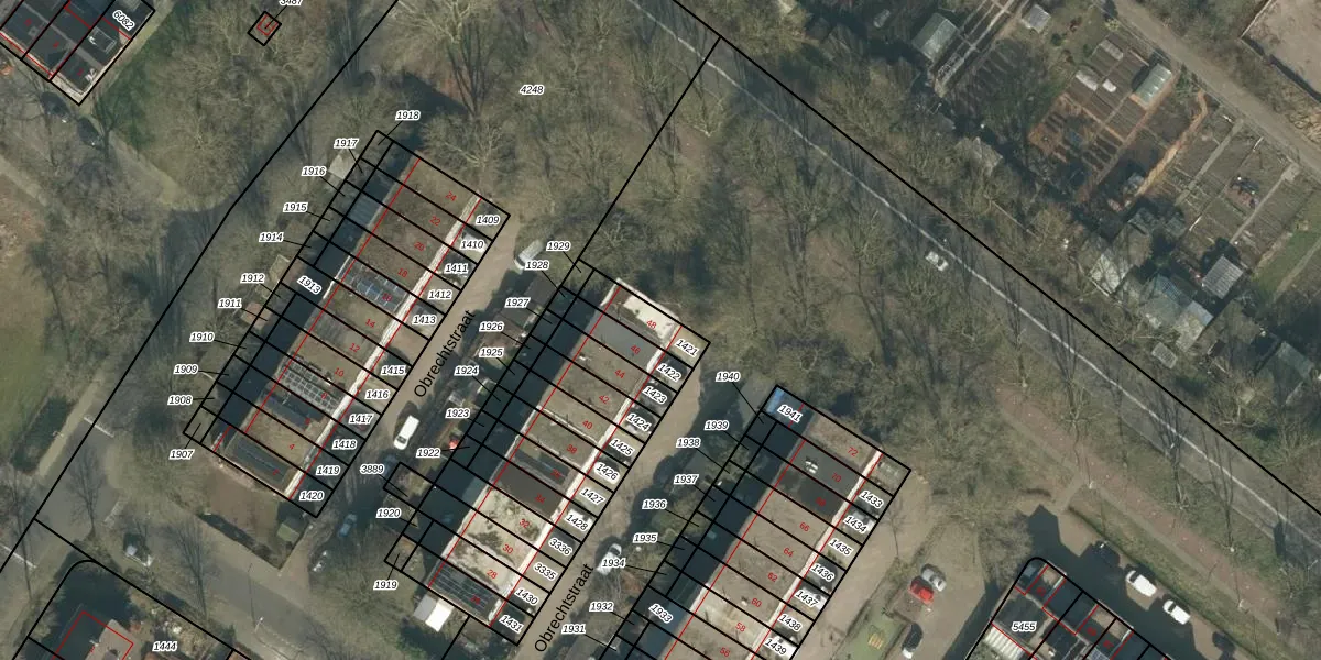 Het perceel waarop Obrechtstraat 48 staat heeft een oppervlakte van 99 m². Dit is een klein perceel. De perceeloppervlakte wordt geregistreerd door het Kadaster. Gedetailleerde informatie over de maten van dit perceel kunt u vinden in het rapport Kadastrale kaart met maatvoering van Obrechtstraat 48.