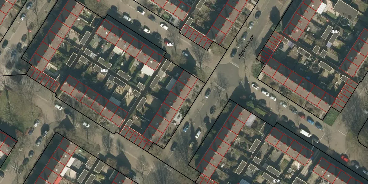 Het perceel waarop Obrechtstraat 55 staat heeft een oppervlakte van 4555 m². Dit is een zeer groot perceel. De perceeloppervlakte wordt geregistreerd door het Kadaster. Gedetailleerde informatie over de maten van dit perceel kunt u vinden in het rapport Kadastrale kaart met maatvoering van Obrechtstraat 55.