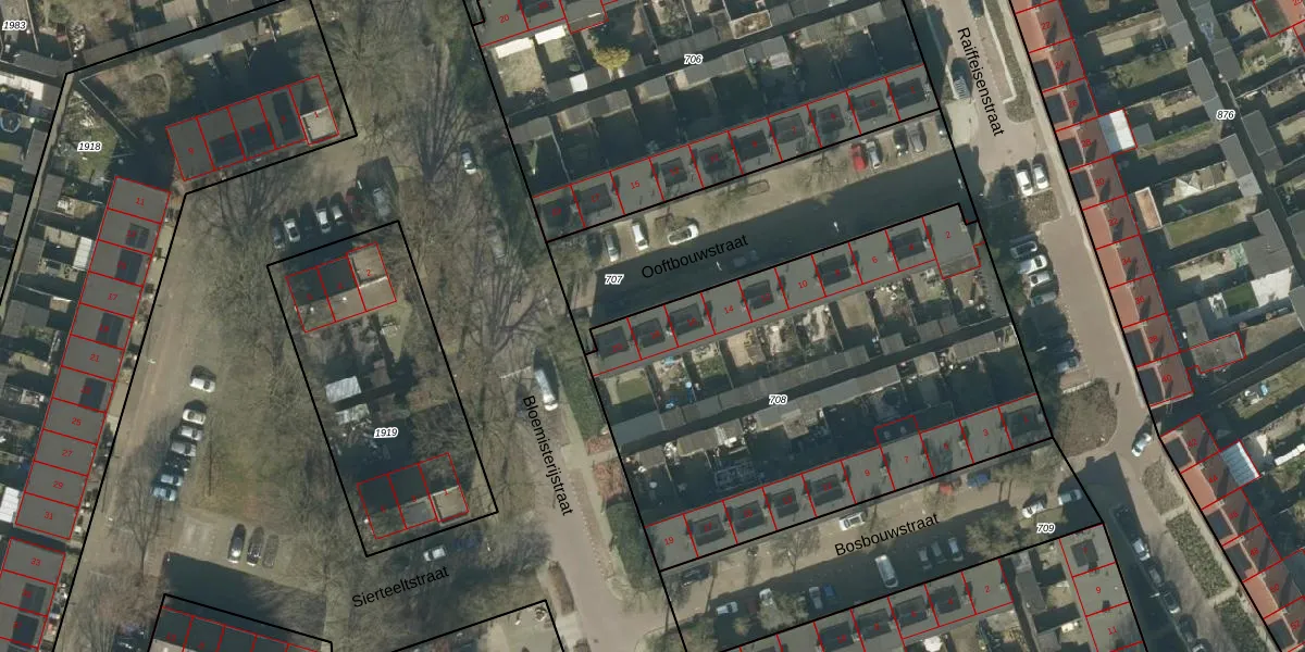 Het perceel waarop Ooftbouwstraat 18 staat heeft een oppervlakte van 2447 m². Dit is een zeer groot perceel. De perceeloppervlakte wordt geregistreerd door het Kadaster. Gedetailleerde informatie over de maten van dit perceel kunt u vinden in het rapport Kadastrale kaart met maatvoering van Ooftbouwstraat 18.