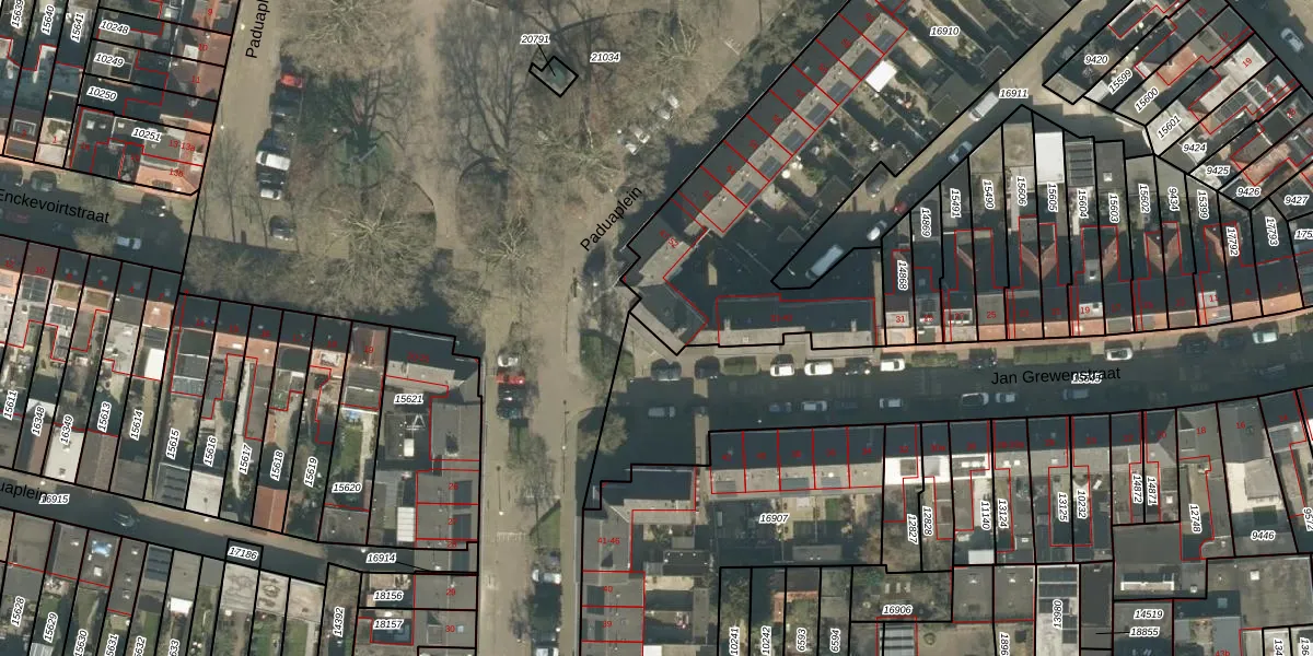 Het perceel waarop Paduaplein 48 staat heeft een oppervlakte van 2515 m². Dit is een zeer groot perceel. De perceeloppervlakte wordt geregistreerd door het Kadaster. Gedetailleerde informatie over de maten van dit perceel kunt u vinden in het rapport Kadastrale kaart met maatvoering van Paduaplein 48.