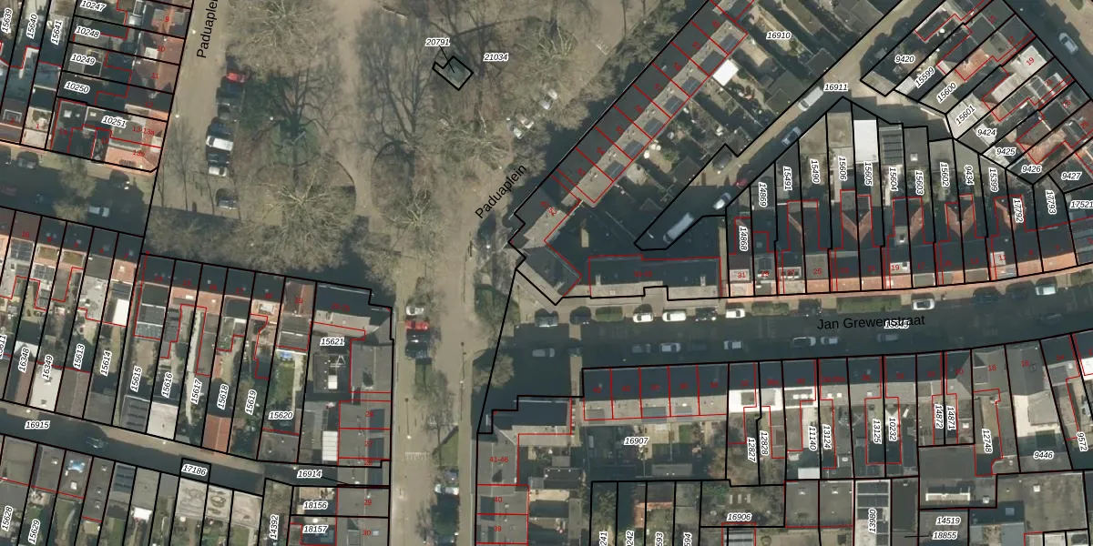 Het perceel waarop Paduaplein 50 staat heeft een oppervlakte van 2515 m². Dit is een zeer groot perceel. De perceeloppervlakte wordt geregistreerd door het Kadaster. Gedetailleerde informatie over de maten van dit perceel kunt u vinden in het rapport Kadastrale kaart met maatvoering van Paduaplein 50.