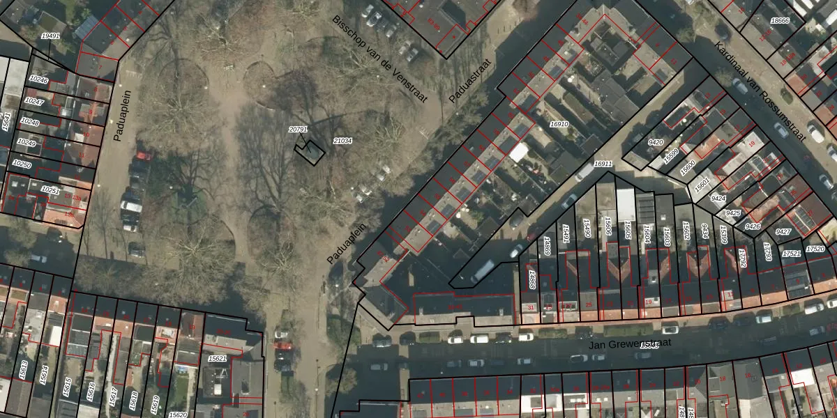 Paduaplein 54 is gelegen op kadastraal perceel TBG01N16910. Deze kadastrale aanduiding is uniek en wordt gebruikt door het Kadaster om eigendomsrechten en andere zakelijke rechten vast te leggen. Het perceel maakt onderdeel uit van de kadastrale gemeente Tilburg.