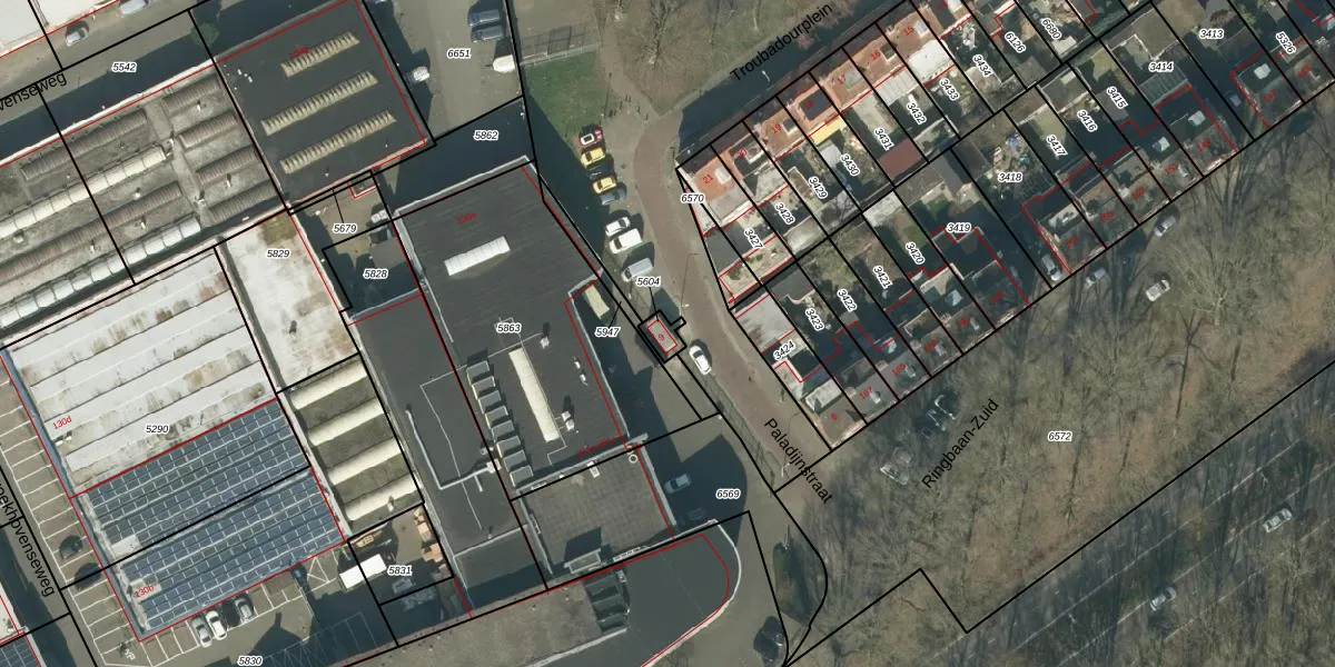 Paladijnstraat 9 is gelegen op kadastraal perceel TBG01R5604. Deze kadastrale aanduiding is uniek en wordt gebruikt door het Kadaster om eigendomsrechten en andere zakelijke rechten vast te leggen. Het perceel maakt onderdeel uit van de kadastrale gemeente Tilburg.