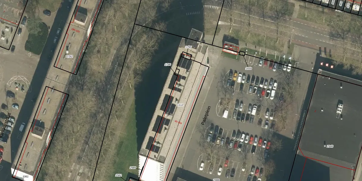 Het perceel waarop Paletplein 124 staat heeft een oppervlakte van 1067 m². Dit is een zeer groot perceel. De perceeloppervlakte wordt geregistreerd door het Kadaster. Gedetailleerde informatie over de maten van dit perceel kunt u vinden in het rapport Kadastrale kaart met maatvoering van Paletplein 124.
