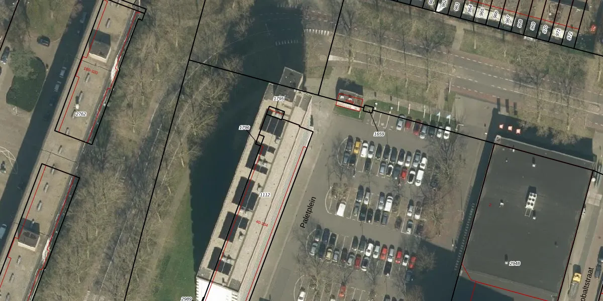 Het perceel waarop Paletplein 40 staat heeft een oppervlakte van 1067 m². Dit is een zeer groot perceel. De perceeloppervlakte wordt geregistreerd door het Kadaster. Gedetailleerde informatie over de maten van dit perceel kunt u vinden in het rapport Kadastrale kaart met maatvoering van Paletplein 40.